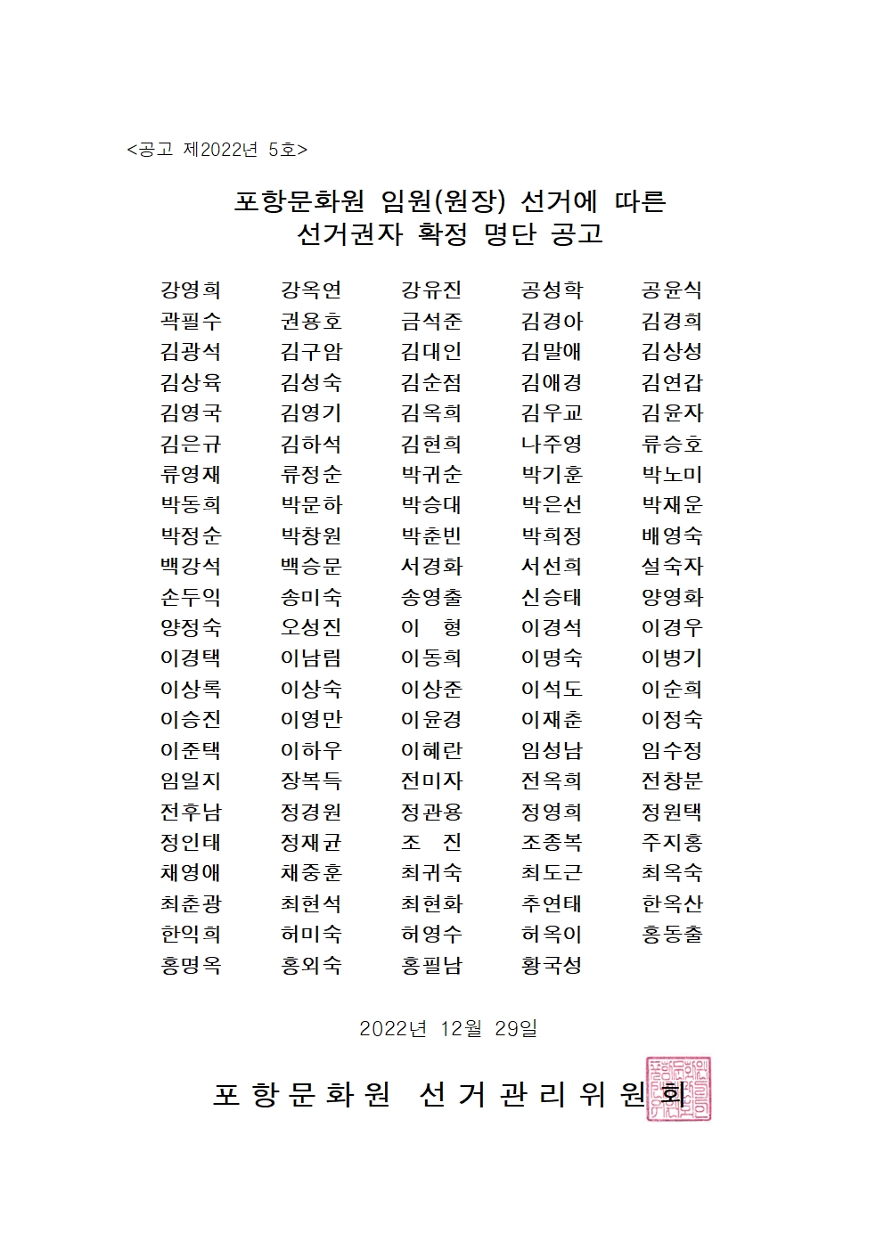 포항문화원 원장 선거에 따른 선거권자 확정 명단 공고