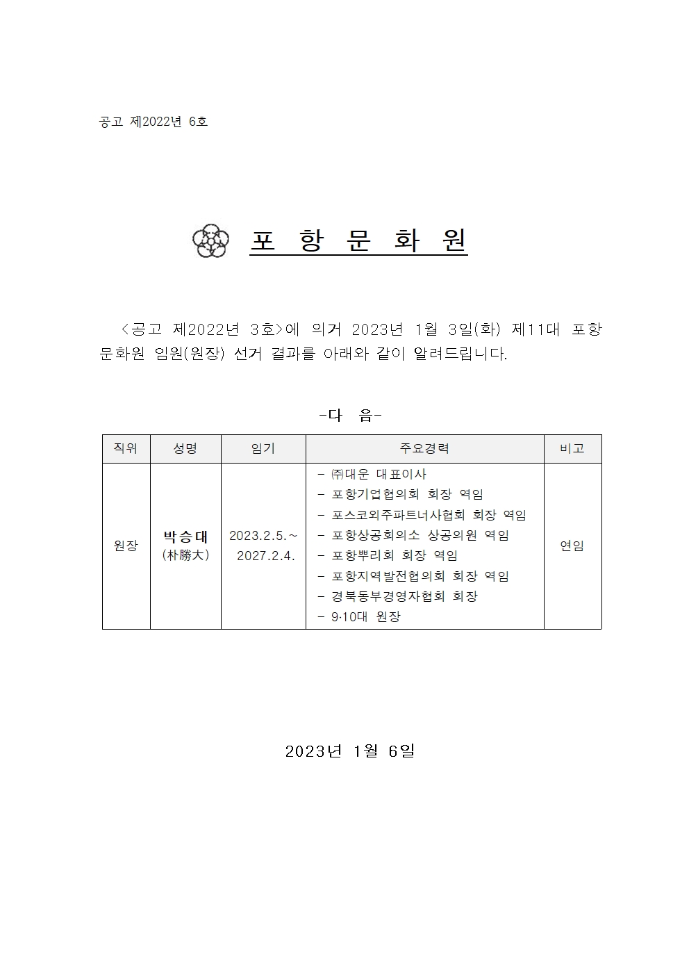 1월 3일(화) 제11대 포항문화원 임원(원장) 선거 결과를 알려드립니다.