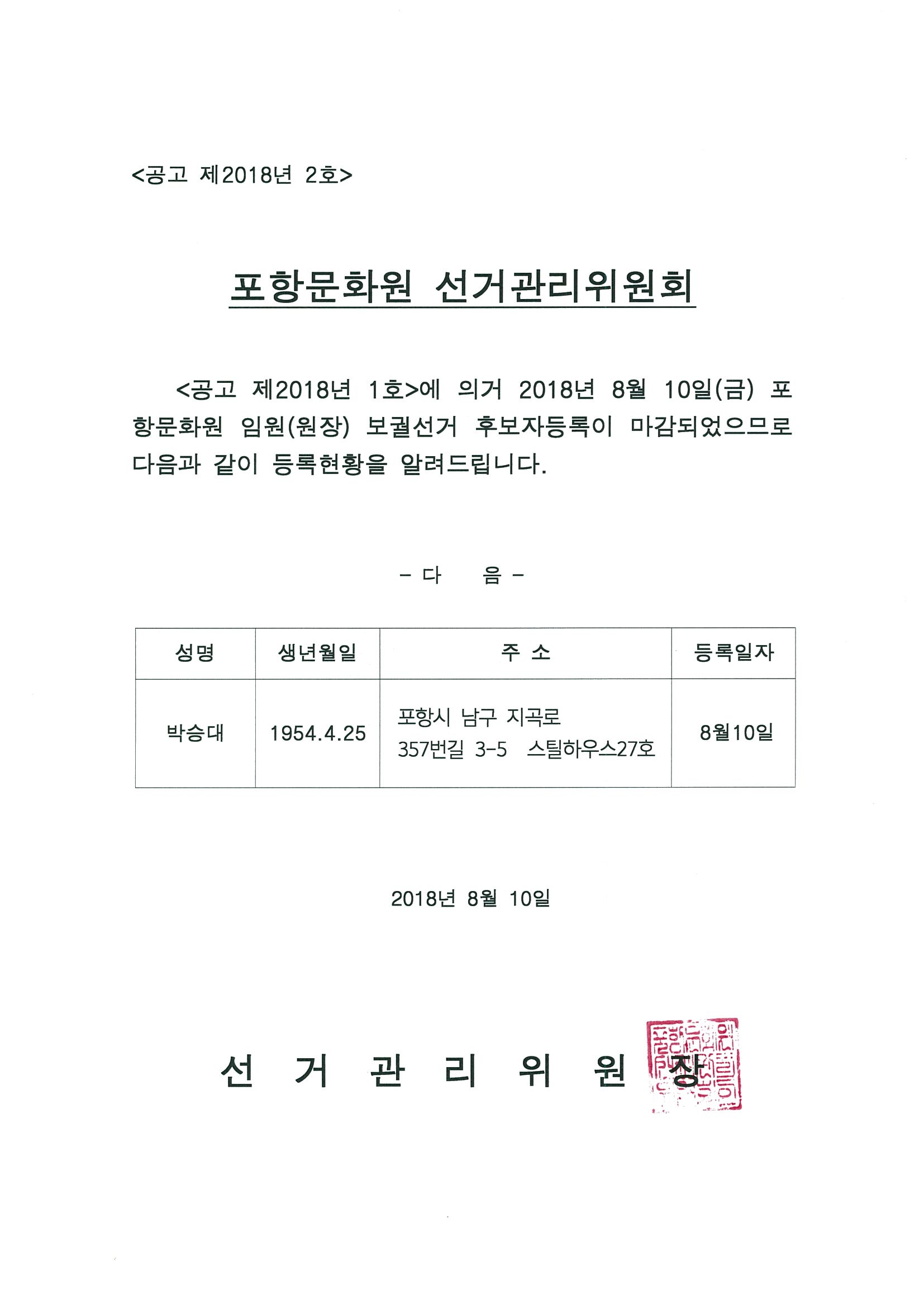 포항문화원 임원(원장) 보궐선거 후보자 등록 마감 안내