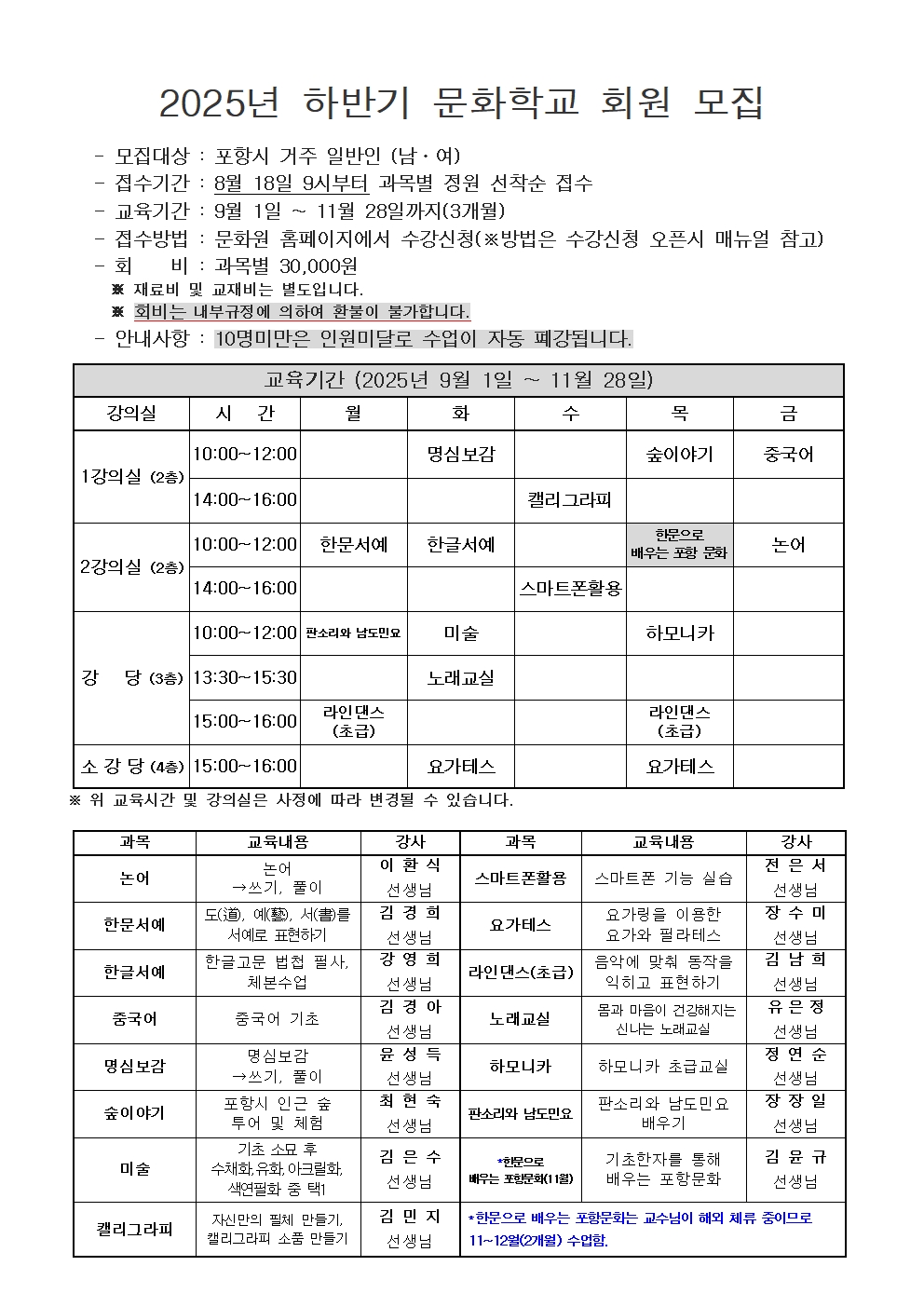 ★하반기 과정 중 '한문으로 배우는 포항'은 교수님 해외체류 관계로 11월에 개강합니다.(2개월 과정)