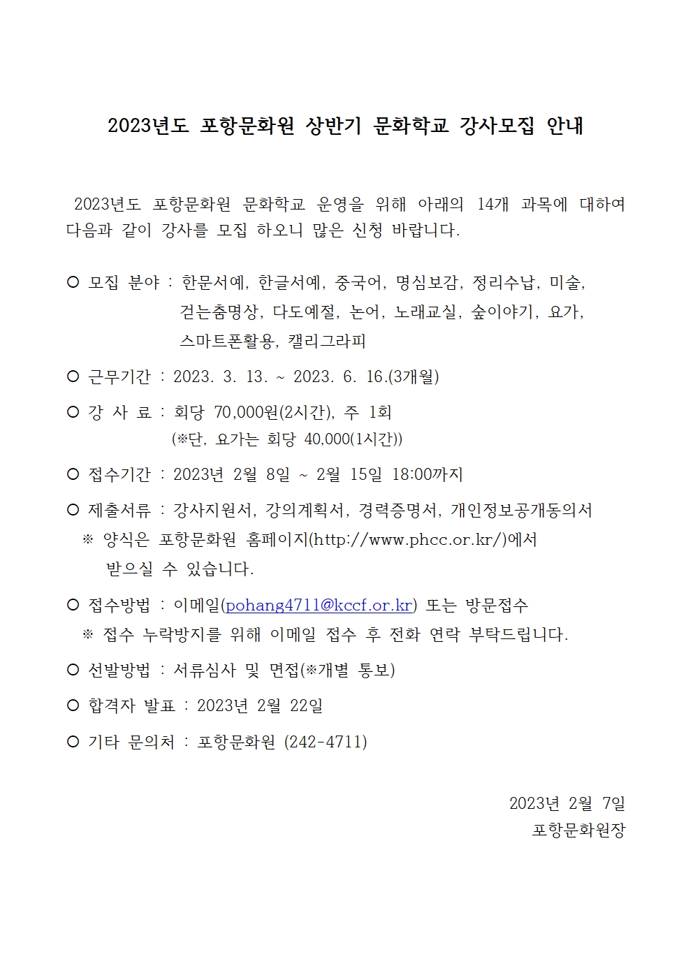 2023년도 포항문화원 상반기 문화학교 강사를 모집하오니 많은 지원바랍니다.