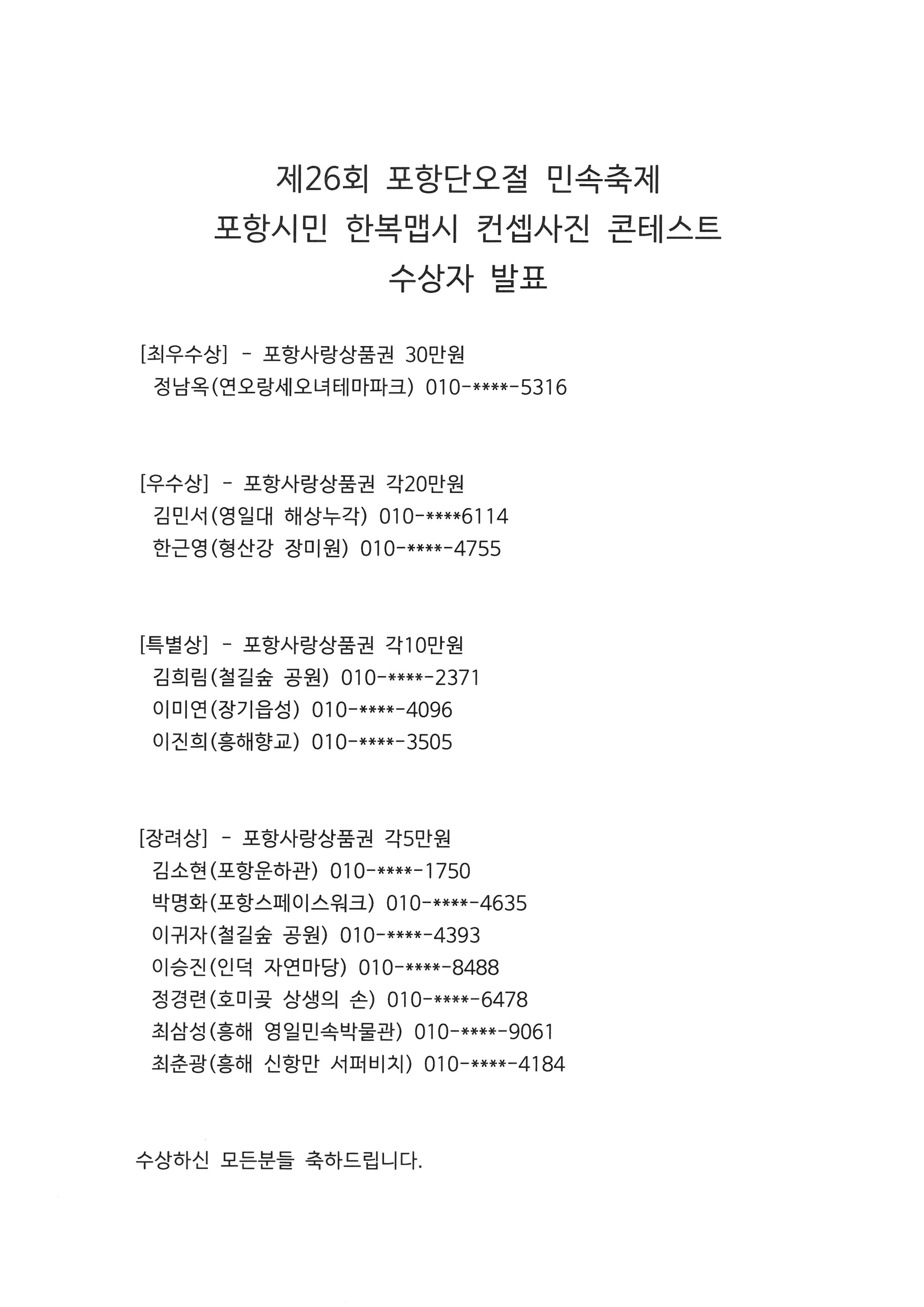 제26회 포항단오절민속축제 한복맵시 컨셉사진 콘테스트 수상자 발표