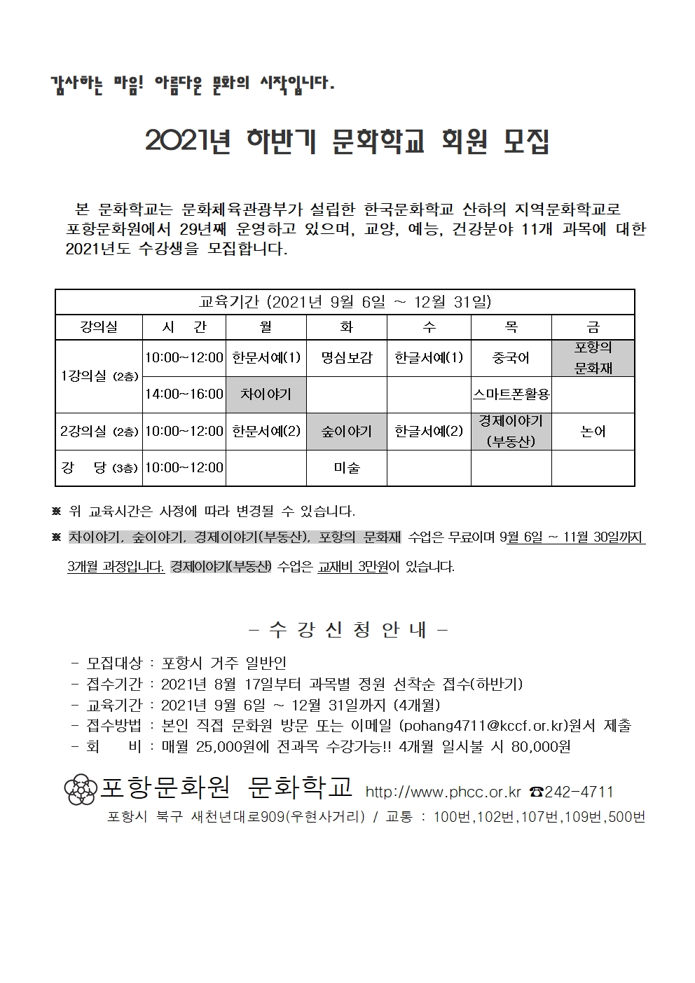 2021년도 하반기 문화학교 모집하오니 많은 신청 부탁드립니다.